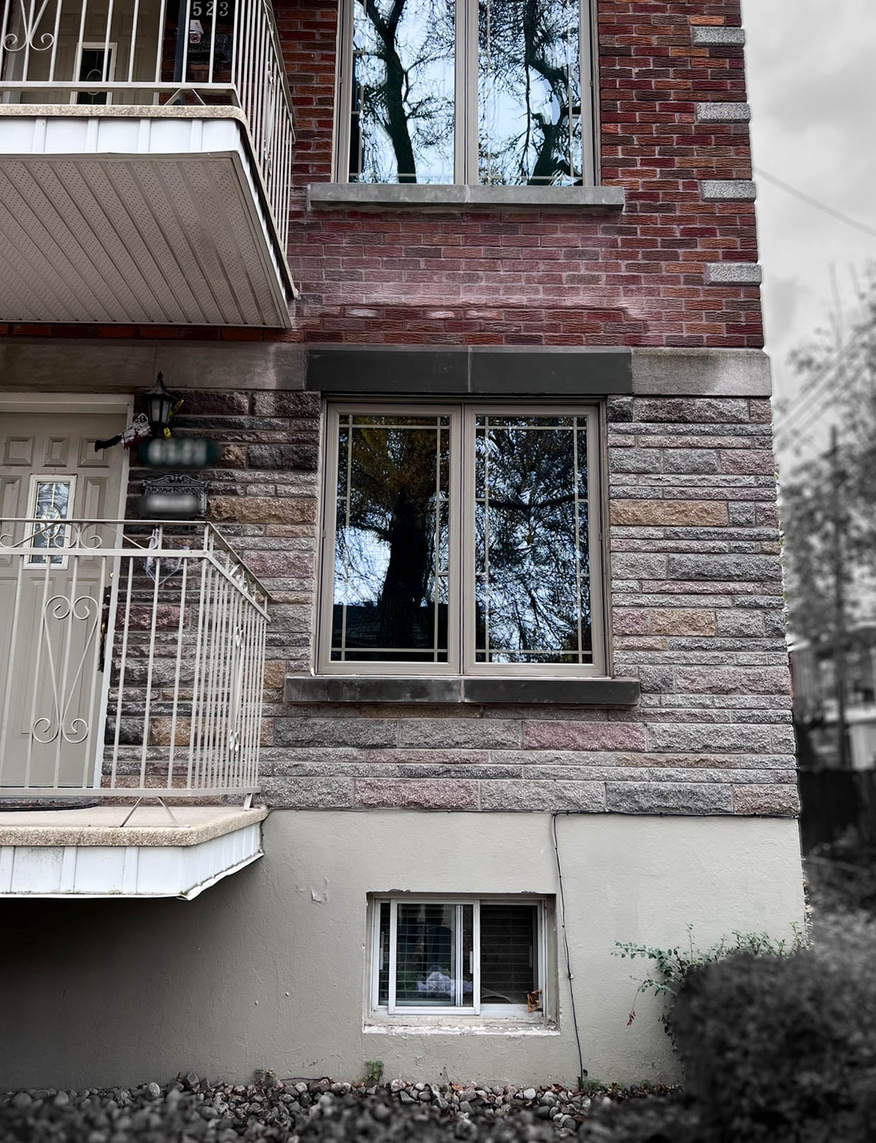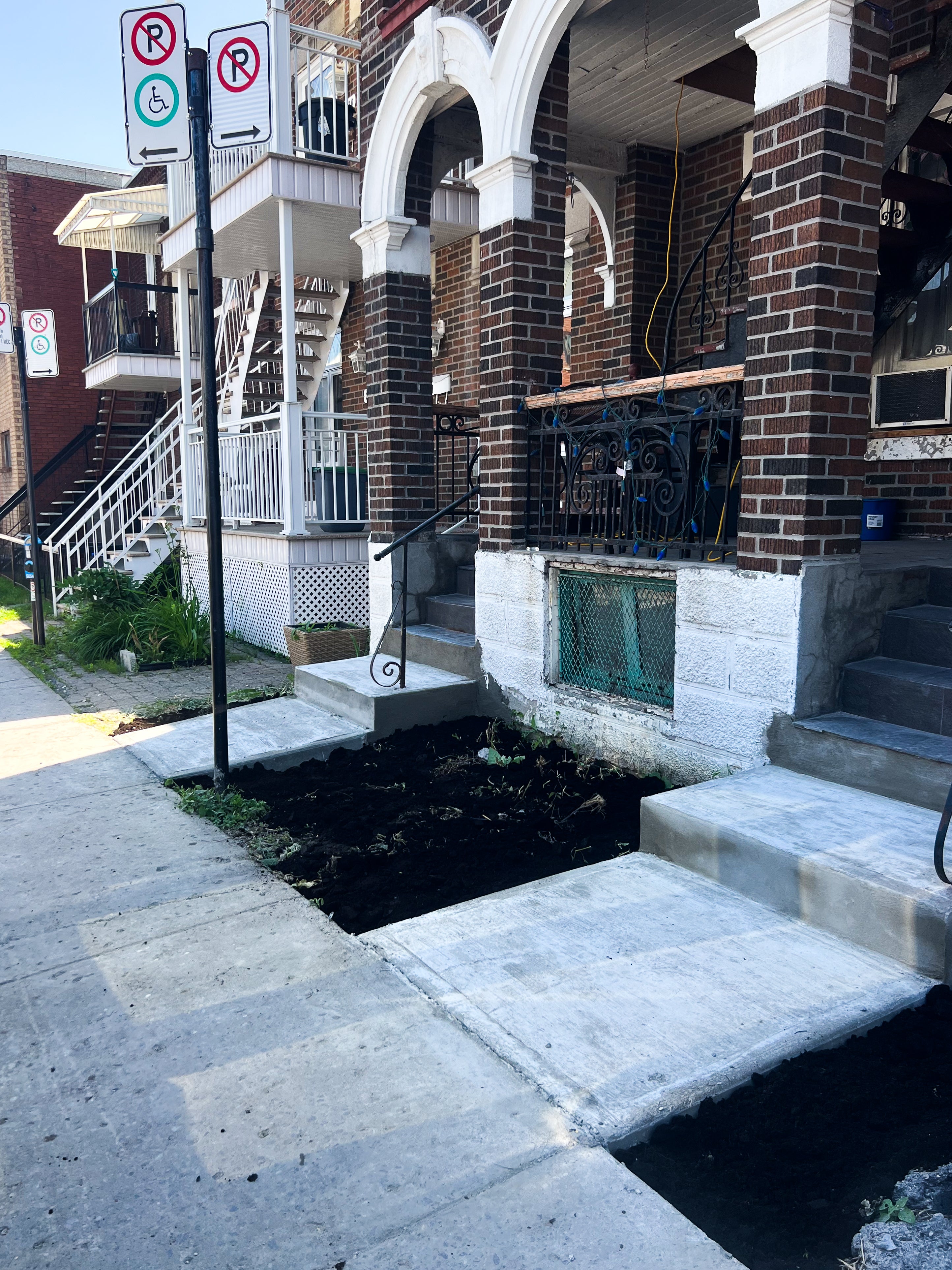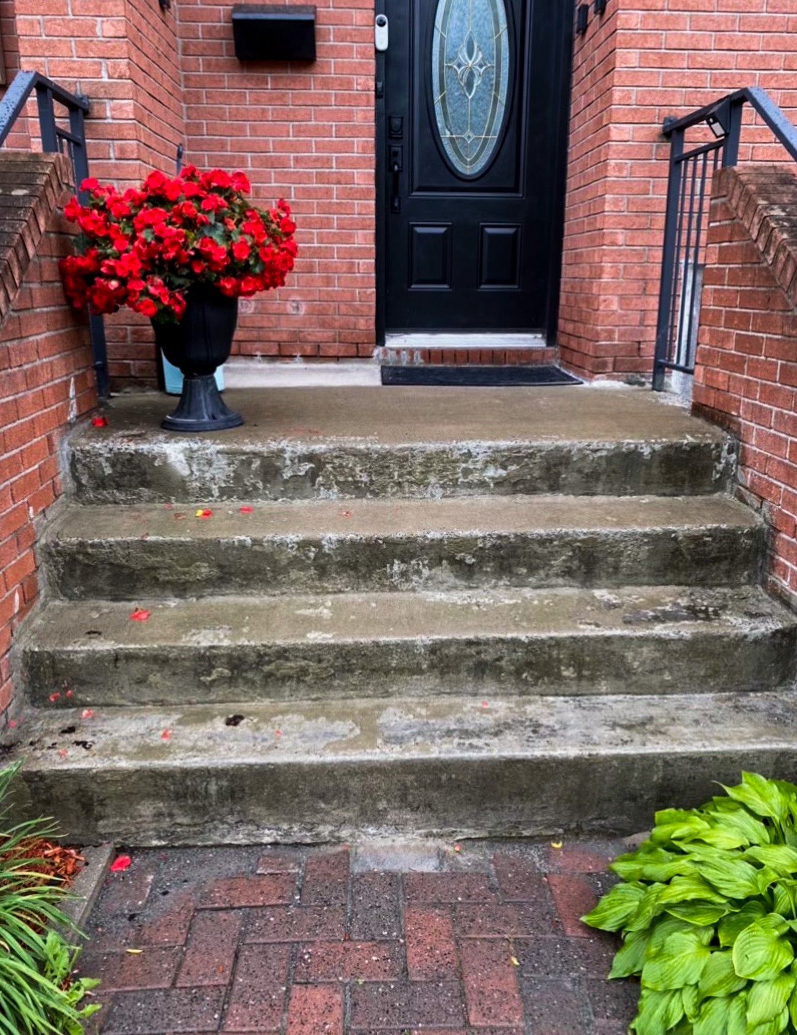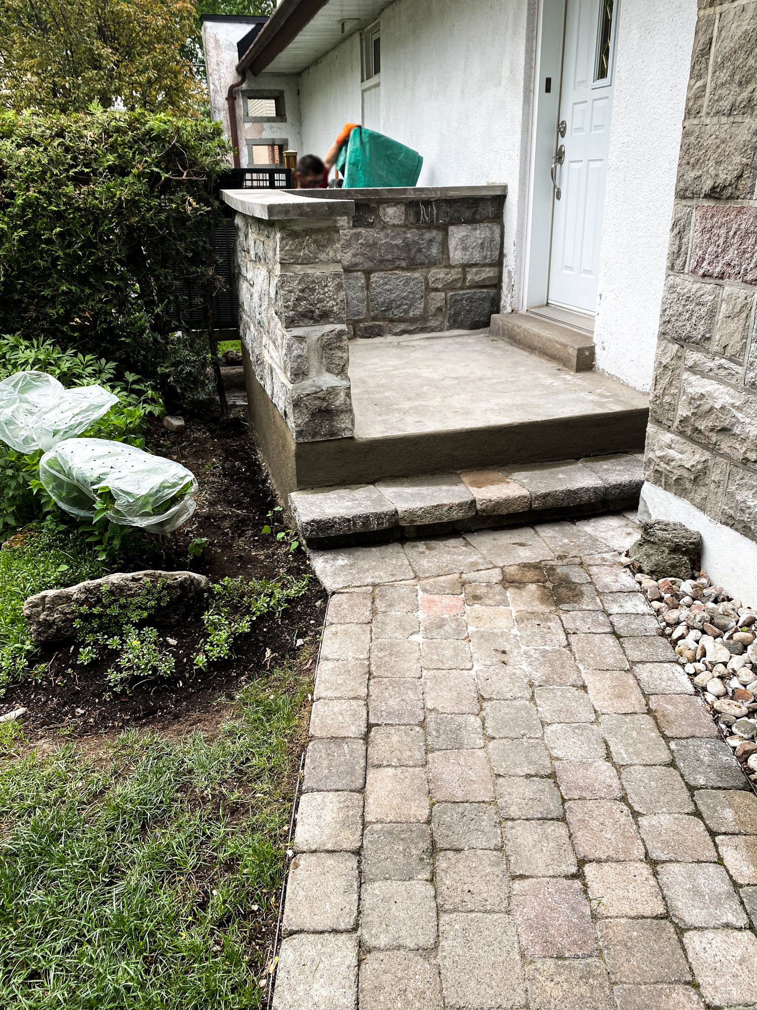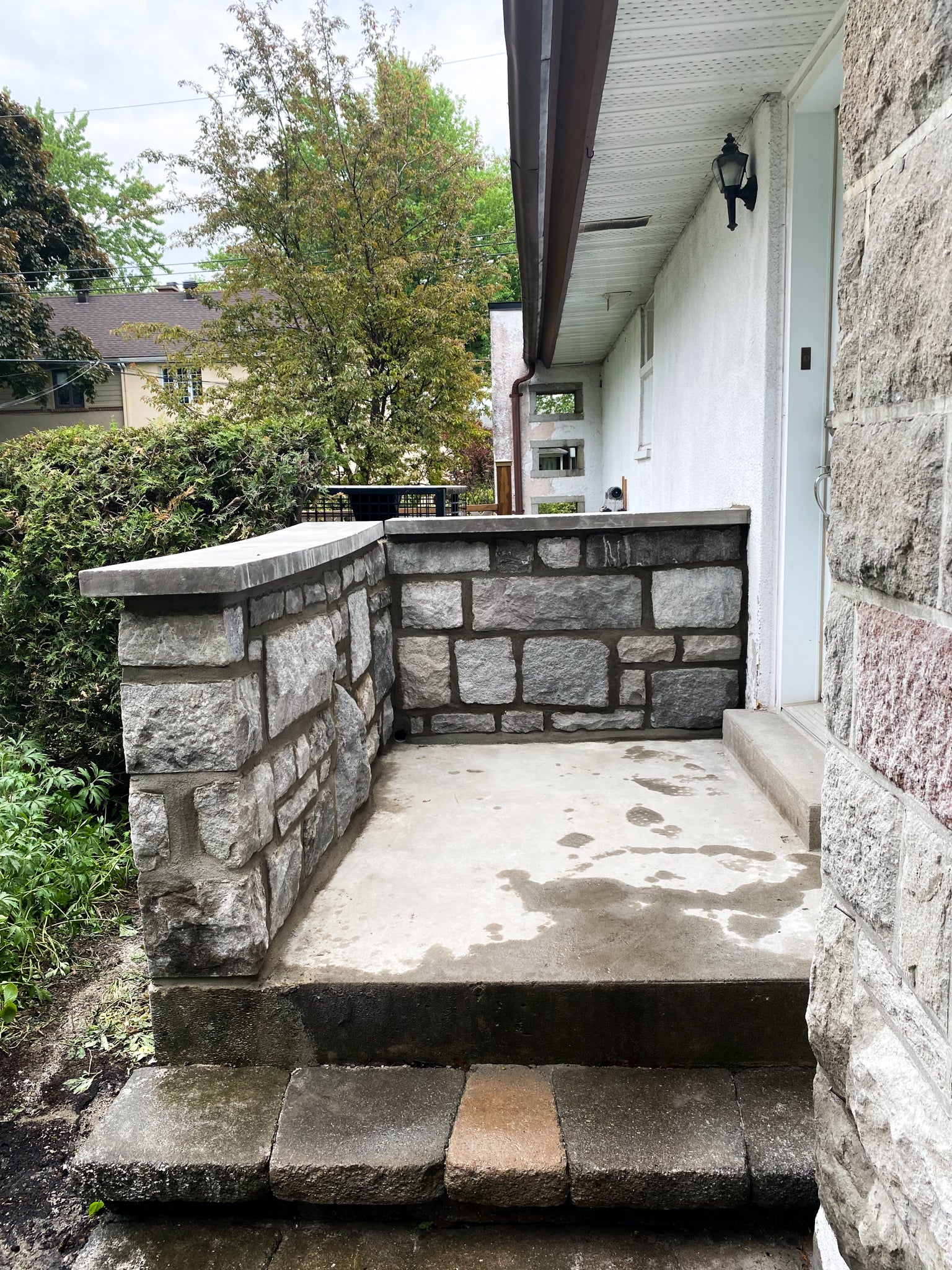 Avant les travaux de maçonnerie, le muret en pierre présentait une érosion importante et commençait à perdre sa stabilité. Les marches en béton extérieures, abîmées par les hivers rigoureux de Montréal, s’effritaient peu à peu et se dégradaient